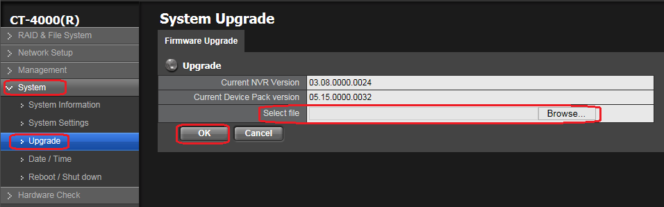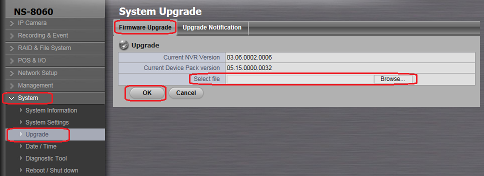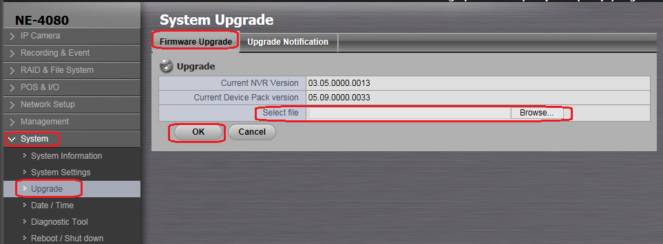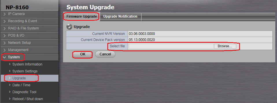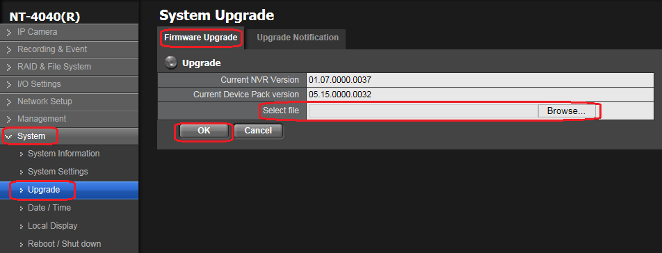 Please go to "Firmware Upgrade" tab in "Upgrade" sub page under "System" page in NVRmini2 setting. Browse to import the downloaded Device Pack file and click OK.