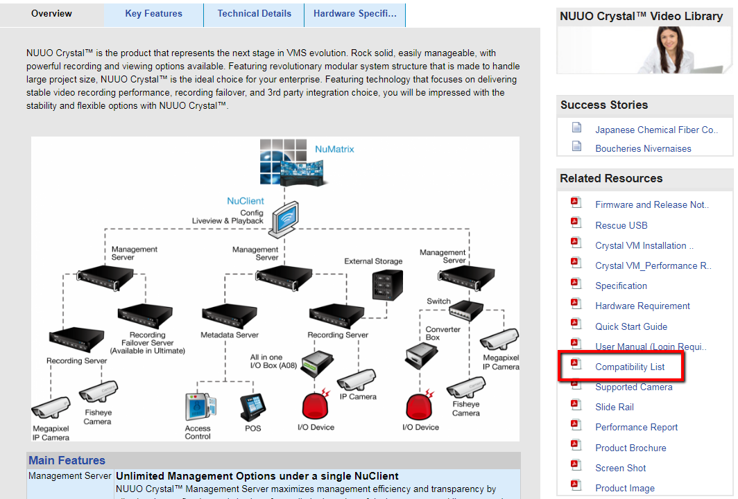 Go to "NUUO website > Product" to select the NVR product then select "Compatible list" to find out the Hard Drive part to check the supported HDD model. For example, to find out the Crystal compatible HDD model:
